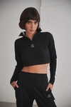 Confeccionado en tejido deportivo con frisa y spandex, tiene corte entallado y largo a la cintura (crop).